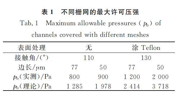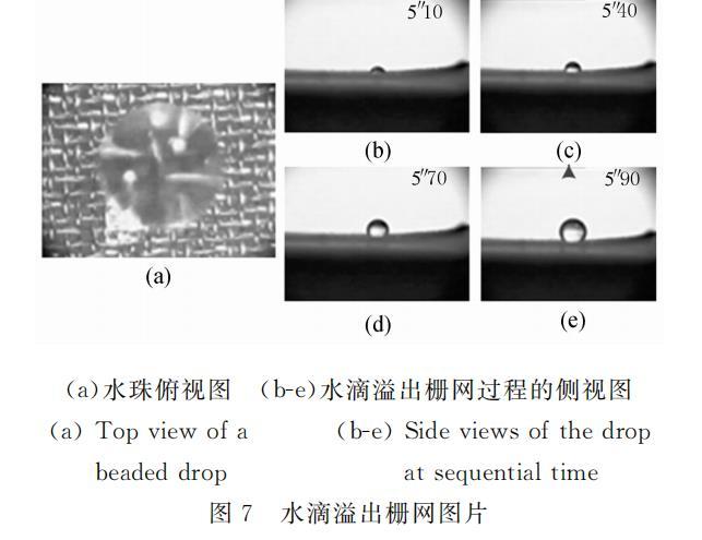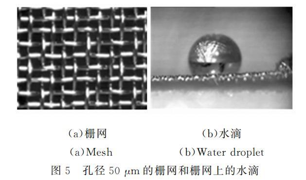 所用柵網(wǎng)為不銹鋼濾網(wǎng),有一定剛度,管道較窄,可以保證管道頂面平整。柵網(wǎng)孔為方形,使用的兩種柵網(wǎng)孔邊長(zhǎng)分別為50mu m和77mu m。部分柵網(wǎng)涂覆Teflon(AF2400,DuPont),部分沒(méi)有做處理。圖5所示為未經(jīng)處理的柵網(wǎng)和柵網(wǎng)上的水滴。
