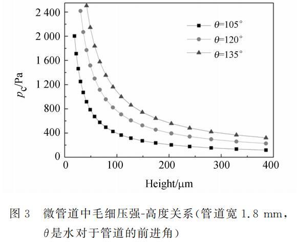 其中,l_i是液體與管道第i條邊接觸線的長(zhǎng)度,theta_i是液體對(duì)于管道第i條邊的前進(jìn)角,對(duì)于矩形管道有i=1,2,3,4。毛細(xì)壓強(qiáng)和管道高度的關(guān)系如圖3所示。液體在疏水網(wǎng)表面的流動(dòng)阻力計(jì)算比較復(fù)雜,現(xiàn)在有很多的研究文獻(xiàn),由于這不是本文的研究重點(diǎn),文中采用了簡(jiǎn)化分析,即把柵網(wǎng)作為一個(gè)光滑的表面。計(jì)算中認(rèn)為柵網(wǎng)與管道的表面特性相同。