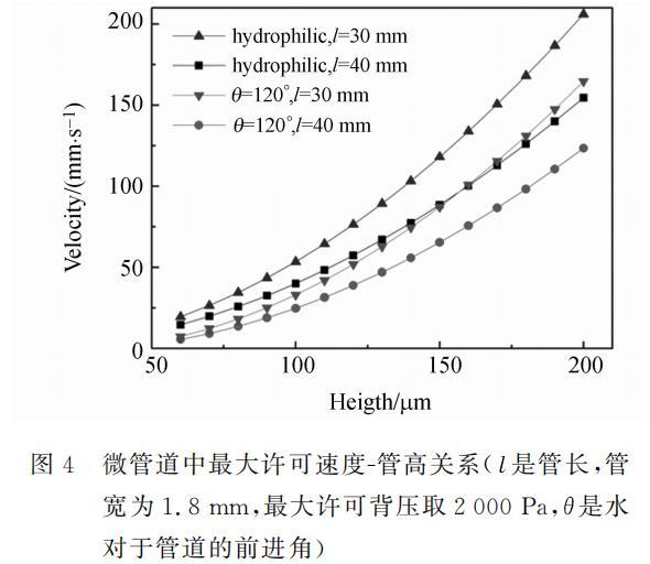 利用約束條件式(5)或(6),可以得到管道中液體的最大許可速度。為了簡(jiǎn)化分析,假設(shè)出口處壓強(qiáng)為0。計(jì)算中假設(shè)管道各個(gè)壁面性質(zhì)相同。利用式(4)計(jì)算壓降時(shí)要求流動(dòng)定常,當(dāng)液體流過(guò)干燥管道時(shí)并不是定常流動(dòng),利用式(4)作近似計(jì)算。最大許可速度與管道高度的關(guān)系如圖4所示,包括疏水管道和親水管道兩種情況。可以看出,管高一定時(shí),在親水管道中最大許可速度較大,且最大許可速度隨管高增加而增大,隨管長(zhǎng)的增加而減小。