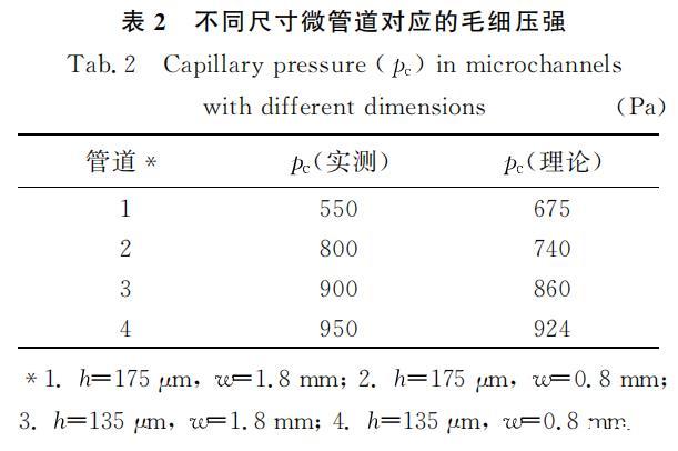 當(dāng)水流過(guò)干燥管道時(shí),表面張力產(chǎn)生的毛細(xì)壓強(qiáng)阻礙水的流動(dòng),此時(shí)的速度-壓強(qiáng)關(guān)系如圖8所示。在圖8的每條曲線上都有一個(gè)轉(zhuǎn)折點(diǎn),且在轉(zhuǎn)折點(diǎn)之后水的流速迅速增加,轉(zhuǎn)折處的壓強(qiáng)被作為毛細(xì)壓強(qiáng)p。對(duì)于這種現(xiàn)象可解釋為在壓強(qiáng)小于毛細(xì)壓強(qiáng)的時(shí)候,水只能在重力作用下極緩慢流動(dòng),由于速度極慢,沿程水頭損失可忽略不計(jì);當(dāng)壓強(qiáng)大于毛細(xì)壓強(qiáng)時(shí),黏性力和壓強(qiáng)差平衡,這時(shí)的流速增加較快。毛細(xì)壓強(qiáng)Pc的實(shí)測(cè)值和理論值如表2所示。水對(duì)于PDMS和壓敏膠的前進(jìn)角都是120°,對(duì)于Teflon涂膜的柵網(wǎng)接觸角是150°(芬蘭Kibron公司生產(chǎn)的Delta-8全自動(dòng)高通量表面張力儀)。實(shí)驗(yàn)結(jié)果與理論計(jì)算一致。