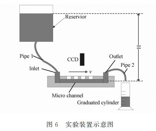 實(shí)驗(yàn)裝置如圖6所示。由于人口、出口和管子尺寸都遠(yuǎn)大于微管道尺寸,測(cè)得的水頭高度H視為加在微管道人口的總水頭。