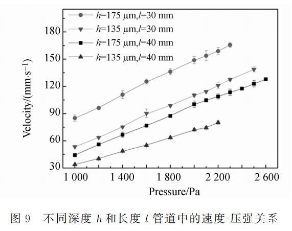管道中充滿水時(shí)的速度-壓強(qiáng)關(guān)系如圖9所示。管道截面尺寸主要通過(guò)等效水力直徑影響摩擦阻力系數(shù)。由于管道深度遠(yuǎn)小于寬度,管道的等效水力直徑取決于管道深度,故這里固定管道寬度而對(duì)不同深度的管道進(jìn)行比較分析。由圖9可知,壓強(qiáng)一定,管道越深,長(zhǎng)度越短,對(duì)應(yīng)的流速越大。圖中每條曲線的最大壓強(qiáng)就是測(cè)量中每個(gè)管道的最大許可壓強(qiáng),這些壓強(qiáng)值都大于表1中的最大許可壓強(qiáng)實(shí)測(cè)值。這一方面是由于柵網(wǎng)孔徑分布不均勻,另一方面是由于沿程水頭損失作用,管道中壓強(qiáng)分布沿流動(dòng)方向減小,導(dǎo)致最大壓強(qiáng)沒(méi)有出現(xiàn)在孔徑最大的地方,從而得到的壓強(qiáng)大于靜止?fàn)顟B(tài)下測(cè)得的最大許可壓強(qiáng)。