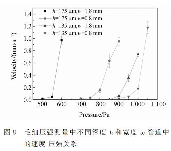 PDMS微管道采用軟光刻工藝制作。PDMS結(jié)構(gòu)層從模具揭下后,倒過(guò)來(lái)粘接在基底上,管道裸露朝上,形成開(kāi)放管道。然后用壓敏膠(ARclad IS-7876,Adhesives Research.Inc.)將棚網(wǎng)粘接到開(kāi)放管道上。制作的微管道寬分別為0.8~mm和1.8~mm,深75mu m和115mu m,長(zhǎng)3cm和4cm。壓敏膠厚約60mu m,最終得到的開(kāi)放管道高度約135μm和175μm。