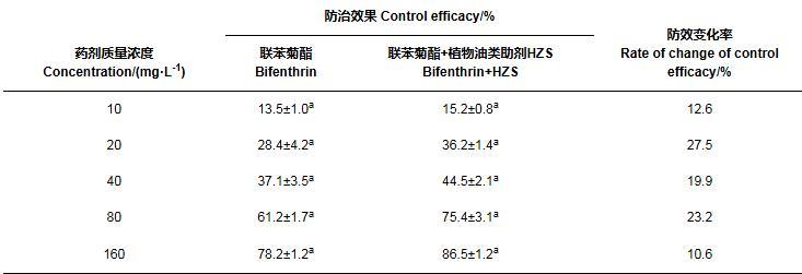 表6添加植物油類助劑HZS后100 g/L聯(lián)苯菊酯乳油對石斛菲盾蚧田間防效的變化