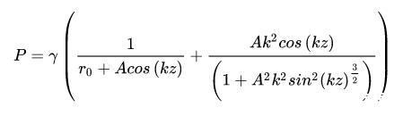 這里,是未受到擾動的水柱半徑,A表征擾動的大小,而k是波數,表示擾動范圍的大小。很容易,我們可以計算出兩個方向的曲率半徑,進而根據Young-Laplace方程計算出流體內部各處的壓力(我們假定外壓為零):