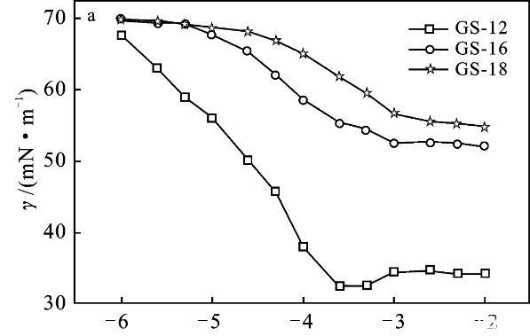 圖5表面活性劑GS-12,GS-16,GS-18溶液的表面張力隨濃度變化曲線(a)和Gemini表面活性劑的表面張力隨KBr鹽濃度的變化曲線(b~d)