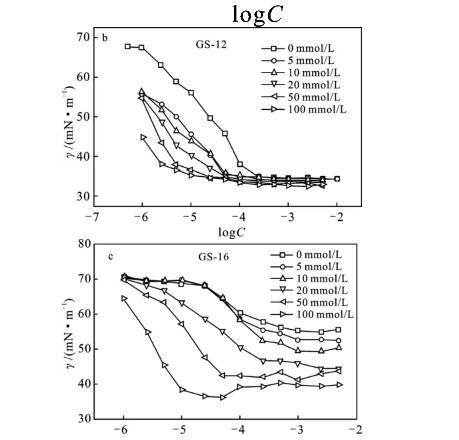 表面張力測(cè)量是研究表面活性劑CMC值的一種有效方法。濃度的增加降低了溶液的表面張力,然后達(dá)到一個(gè)恒定值,則會(huì)產(chǎn)生一個(gè)明確的轉(zhuǎn)折點(diǎn),表明膠束化的開始。在CMC之下,表面活性劑分子排布于空氣/水界面上來降低表面張力。在CMC以上,外加表面活性劑單體,當(dāng)表面活性劑單體充分填充表面時(shí),更傾向于與膠束結(jié)合而不是進(jìn)入界面膜[3,7]。因此,γ與lgC的關(guān)系圖陡然減小,直至達(dá)到CMC,并在CMC以上變得相對(duì)恒定。圖5為不同的KBr鹽濃度下,陽離子Gemini表面活性劑混合溶液的表面張力圖。