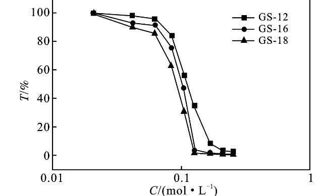 2.2.2耐鹽性能隨著鹽濃度的增加,濁度的突然增加是表面活性劑溶液中宏觀相分離的標(biāo)志,這就是鹽析現(xiàn)象[7,11]。圖4為KBr/GS表面活性劑溶液,隨著KBr含量的增加,在波長(zhǎng)為500 nm的吸光度變化曲線。以GS-12為例,當(dāng)KBr濃度為0~60 mmol/L時(shí),1 mmol/L的Gemini表面活性劑水溶液為無色透明,濁度同時(shí)略有下降,說明有混合膠束形成。當(dāng)KBr的濃度從60 mmol/L增加到120 mmol/L時(shí),溶液呈現(xiàn)微渾濁,說明體系中有少量的表面活性劑顆粒析出。而GS-16,GS-18在更低的濃度下就發(fā)生了鹽析現(xiàn)象。也就是說,鹽的析出現(xiàn)象是非常復(fù)雜的,這不僅取決于鹽的性質(zhì),而且取決于雙子表面活性劑的結(jié)構(gòu)[12-13]。此外,由圖4透過率的變化可知,隨著疏水鏈的增長(zhǎng),表面活性劑的耐鹽性能減弱,更容易受鹽濃度的影響。因?yàn)闊o機(jī)鹽消除離子頭基團(tuán)的電荷,減少吸附膜內(nèi)頭基基團(tuán)與膠束之間的靜電排斥。它們通過減少頭基之間的靜電相互作用和最小化有效截面積來促進(jìn)膠束的產(chǎn)生和聚集,導(dǎo)致表面活性劑從溶液中聚沉而析出[13]。