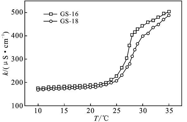 2.2.1 Krafft溫度Krafft溫度影響表面活性劑溶解度,表面活性劑在此溫度以上可以形成膠束。在Krafft溫度以下,以單分散的表面活性劑與水化固體表面活性劑的狀態(tài)存在,而在Krafft溫度以上,水化固體表面活性劑的溶解和膠束形成也參與了平衡[9-10]。質(zhì)量分?jǐn)?shù)1%表面活性劑GS-12,在室溫可以完全溶解,將其溶液置于冰水混合物中1周,溶液仍然澄清透明,沒有渾濁的跡象。表明GS-12的Krafft溫度低于0℃。通過測(cè)量電導(dǎo)率可以得到Krafft溫度的近似值,由圖3可知,GS-16,GS-18的Krafft溫度分別為27,27.5℃。k值在較低溫度下緩慢增加,這是由于離子表面活性劑的溶解度有限。隨著溫度的進(jìn)一步升高,Krafft溫度處的k值急劇增加。k值的增加是由于膠束的形成,水合表面活性劑的溶解度突然增加,直至達(dá)到克拉夫特溫度。此外,離子遷移率增加隨著溫度增加、k逐漸增加[3,10]。結(jié)果表明,Gemini表面活性劑的Krafft溫度隨表面活性劑的疏水鏈長(zhǎng)的增加而升高。