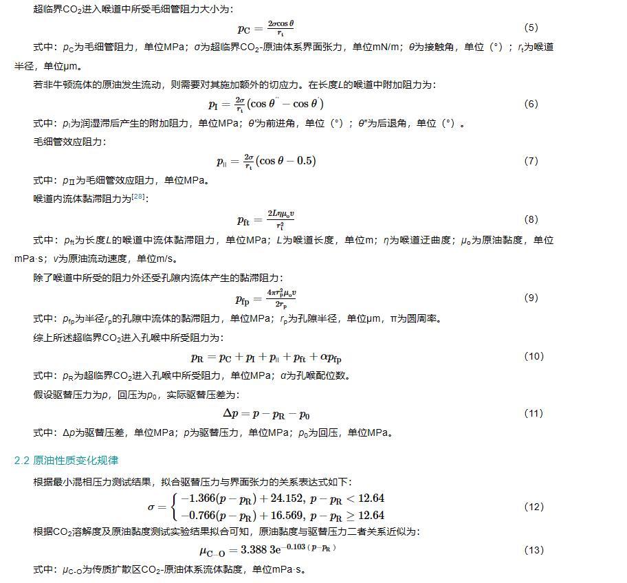 CO2進(jìn)入孔喉時(shí)與原油的接觸時(shí)間較短,來(lái)不及進(jìn)行擴(kuò)散、溶解,此時(shí)原油和CO2的物理性質(zhì)尚未發(fā)生變化。超臨界CO2進(jìn)入喉道中所受毛細(xì)管阻力是由超臨界CO2-原油界面張力、潤(rùn)濕接觸角、孔喉半徑等參數(shù)共同引起: