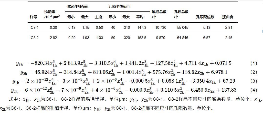 式中:x1h、x2h為C8-1、C8-2樣品的喉道半徑,單位μm;y1h、y2h為C8-1、C8-2樣品不同尺寸的喉道數(shù)量,單位個(gè);x1k、x2k為C8-1、C8-2樣品的孔隙半徑,單位μm;y1k、y2k為C8-1、C8-2樣品不同尺寸的孔隙數(shù)量,單位個(gè)。