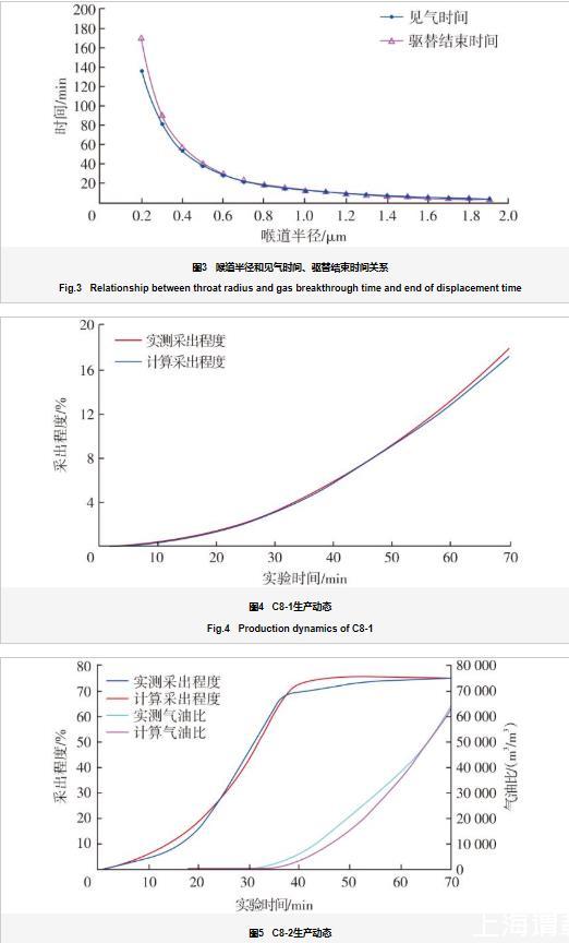 以時間為節點,運用節點分析法計算任一驅替時刻前緣位置以及見氣時間和驅替結束時間(圖3)。選擇時間步長為2 s,從驅替開始起算,在2 s的時間里部分CO2開始進入喉道內部的同時導致驅替壓差發生變化,進一步導致CO2-原油體系的界面張力以及原油黏度發生改變。因此,將驅替進行2 s后的實際驅替壓差以及對應的界面張力、黏度等參數代入第2個時間步參與計算,依次迭代,直至CO2驅過程結束。運用該方法,結合喉道大小及分布頻率特征計算得到C8-1和C8-2巖心并聯CO2驅替全過程生產動態(圖4、圖5)。由圖3可知:見氣時間與驅替結束時間隨喉道半徑的增大而縮短,且喉道越大縮短幅度越小。喉道半徑越大,驅替結束時間與見氣時間的差值越小,可以推斷物性較好的油藏見氣后氣油比上升較快。
