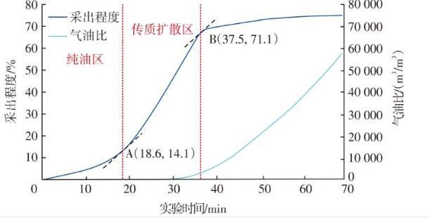 總結以上分析認為,CO2驅生產動態規律為:在CO2驅替前緣未達到井口前采出端為純油流,此階段CO2-原油體系作用時間短,溶解降黏、萃取等作用效果不明顯,因此采油速度小、單井產量低且油井不見氣,如圖6中的純油區,該區域主要依靠CO2驅動力采油,采出程度曲線呈緩慢上升驅勢。隨著開發推進,CO2-原油體系作用時間增加,溶解降黏、萃取等作用逐漸占據主要作用,原油黏度減小,此時油井開始緩慢見氣。如圖6中的傳質擴散區,油井產量增加,采油速度加快,采出程度曲線快速上升。在純油區向傳質擴散區過渡階段,采出程度曲線上存在一切點(圖6中A點),其對應的時間18.6 min為見氣時間,對應的采出程度14.1%為純油區推進至井口時的采出程度。隨著CO2驅的持續進行,傳質擴散區大部分已經推進至采油井附近,油井產氣量迅速增大的同時產油量迅速減小,采出程度緩慢增加直至穩定。在傳質擴散區采出的末段,采出程度曲線上存在一切點(圖6中B點),該點所對應的時間37.5 min近似為驅油結束時間,此時對應的采出程度71.1%為傳質擴散區推進至井口時的采出程度。此后氣油比迅速增大,CO2驅油進入末期。