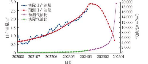 運用主流喉道半徑和滲透率之間的關系將滲透率換算為主流喉道半徑用于計算,滲透率由研究區三維地質模型獲得。圖7為Y30-101井計算得到日產油量、氣油比和實際生產數據,對比發現整體趨勢較為吻合。按照目前開發制度,預計2024年8月日產油量達到2.86 m3,氣油比達到907 m3/m3,隨后日產油量急劇降低,氣油比快速增加,開發人員可及時調整生產制度避免油井過早見氣。