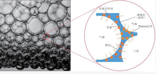 泡沫是一種熱力學(xué)不穩(wěn)定的膠體體系,其中氣體分散在表面活性劑穩(wěn)定的連續(xù)液相中,可以自發(fā)破裂。圖1顯示由表面活性劑形成的典型泡沫結(jié)構(gòu)。提高CO2泡沫的穩(wěn)定性具有挑戰(zhàn)性,因為在高壓儲層條件下,CO2更易溶于水,溶解的CO2會引起泡沫的團聚。