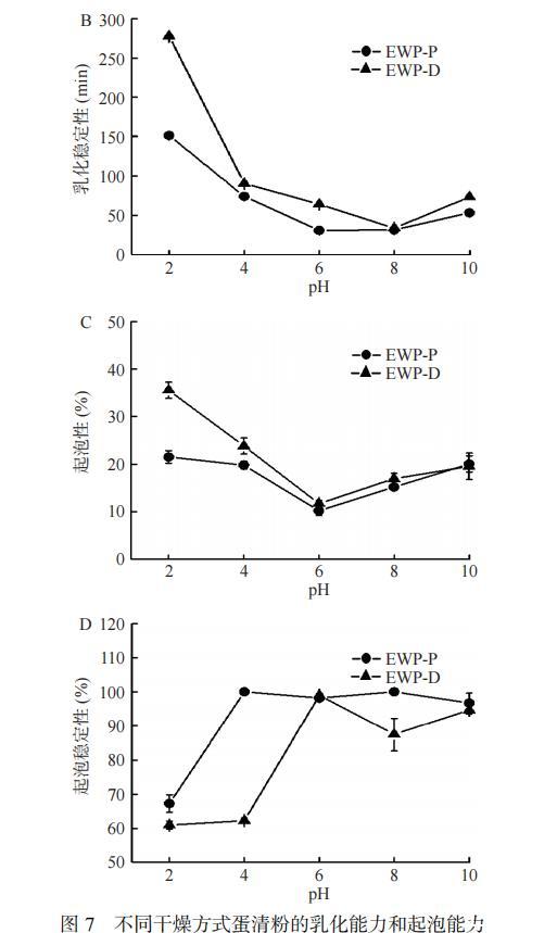 泡沫的形成依賴于由蛋白質(zhì)形成的界面膜及其在懸浮液中保持氣泡和減緩聚結(jié)速率的能力,其中蛋白質(zhì)的發(fā)泡能力和穩(wěn)定性與蛋白與水相在界面上的相互作用有關(guān),受蛋白分子柔性、凈電荷、構(gòu)象和疏水性的影響。蛋清蛋白在pH2.0~10.0條件下的起泡性如圖7C所示,EWP-D的起泡性優(yōu)于EWP-P,這可能是由于EWP-D的溶解度較高,在起泡過程中蛋白能迅速展開,形成能同時連接水相溶劑與空氣界面的兩性介質(zhì),而自身的帶電性又可產(chǎn)生一定的靜電排斥,使蛋白分子在空氣-水界面上呈現(xiàn)規(guī)律性排列,而不會發(fā)生聚集。相比之下,EWP-P在高溫發(fā)生的美拉德反應(yīng)會使蛋白形成更大的空間位阻,進而延緩了蛋白質(zhì)在空氣/液體界面的吸附。pH為6.0時,EWP-P和EWP-D的起泡性較低,分別是10.19%±1.01%和11.7%±0.66%,這是由于該pH下蛋白的溶解度和表面張力較低,蛋白易發(fā)生聚集,故不易形成泡沫。