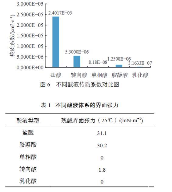 以鹽酸、膠凝酸、轉向酸和乳化酸為對比,測定不同酸液體系傳質系數,實驗結果見圖6。單相酸體系緩速效果最強,比乳化酸體系還下降了一個數量級,緩速率為99.6%,可以達到緩速深部酸化的效果。單相酸相比于乳化酸酸巖反應速度明顯下降,這與乳化酸粒徑研究結論也是相似的:粒徑越小,酸巖反應速度越慢。