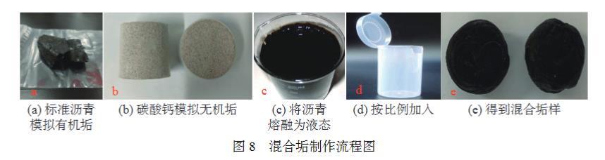 采用瀝青塊模擬有機垢,碳酸鈣(灰巖)模擬無機垢,瀝青和碳酸鈣3∶7混合物模擬混合垢?;旌瞎笜又谱鞑襟E如下:①將瀝青塊敲成小塊放入燒杯;②控溫磁力攪拌器將瀝青融化為液態;③將液態瀝青趁熱導入塑料試管中;④再按比例加入碳酸鈣,在瀝青凝固前攪拌均勻;⑤得到比表面積接近混合垢(瀝青碳酸鈣質量比為3∶7),混合垢制作流程圖見圖8。