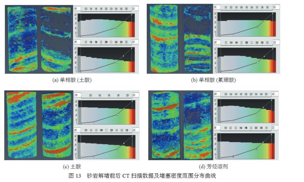 對混合垢傷害解堵前后的巖心進行CT掃描,見圖13。對CT掃描圖像數據密度分布進行處理,紅色區域為以無機質為主的高密度堵塞區域,藍色范圍為有機質為主的低密度堵塞區域,圖中可見單相酸(土酸)傷害解除范圍最大,對高密度的礦物溶蝕性能更好。土酸、芳烴溶劑單獨處理效果差。也可從堵塞物CT密度分布曲線得出相同結論(其中,密度分布曲線中橫坐標代表密度數,按照空氣為0,水為1000進行校正;縱坐標為歸一化密度累計占比,對應曲線為混合垢傷害前巖石密度分布,作為參照。密度分布曲線中彩色區域代表不同密度下CT響應強度),土酸解除了高密度范圍的堵塞,但低密度堵塞沒有解除;芳烴溶劑解除了低密度范圍堵塞,但高密度堵塞沒有解除,而單相酸體系均有解除。