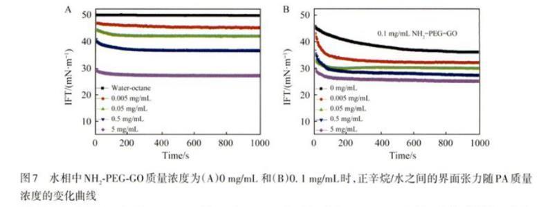 圖7水相中NH2-PEG-GO質量濃度為(A)0 mg/mL和(B)0.1 mg/mL時,正辛烷/水之間的界面張力隨PA質量濃度的變化曲線