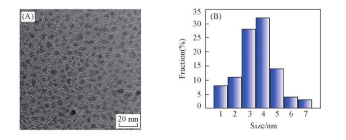通過傅里葉變換紅外光譜(FTIR)、透射電子顯微鏡(TEM)和X射線衍射(XRD)對DA-GQD的結構進行表征。從FTIR譜圖(圖S1,見本文支持信息)可知,DA-GQD可能包含C—H,O—H,O═C(R)—和C—N基團。從TEM和粒徑分布圖(圖2)可以看出,DA-GQD顆粒比較均勻,基本上為橢球形納米顆粒,粒徑主要分布在1~7 nm,平均粒徑約為3.5 nm。XRD譜圖(圖S2,見本文支持信息)中在20°左右有一個較寬的峰,說明合成的DA-GQD具有石墨烯結構。