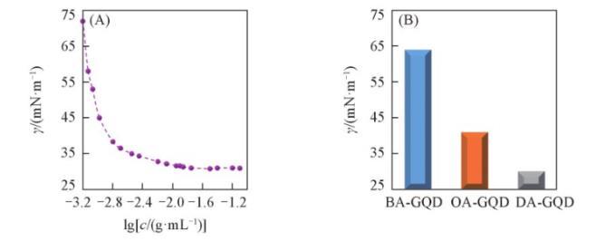 為了研究烷基鏈中碳原子數對表面活性的影響,按照1.2.1節方法,用丁胺和辛胺代替十二胺,分別制備了丁胺功能化石墨烯量子點(BA-GQD)和辛胺功能化石墨烯量子點(OA-GQD),并測定其最低表面張力。由圖3(B)可知,DA-GQD的表面張力比BA-GQD和OA-GQD的表面張力低得多,表現出更好的表面活性。3種石墨烯量子點的主要區別在于烷基胺的碳鏈長度,結果表明,烷基碳鏈長度對石墨烯量子點的表面活性有較大影響,烷基鏈越長,表面活性越好。上述規律與經典的表面化學理論一致。