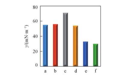 圖4對比了DA-GQD與文獻中常用于穩定Pickering乳液的固體顆粒表面活性劑氧化石墨烯(GO)、石墨烯(G)、GQD和氧化亞銅(Cu2O)納米顆粒,以及典型陰離子表面活性劑SDBS的最低表面張力。結果顯示,GO,G和Cu2O納米顆粒具有較低的水溶性,可以將水的表面張力降低到50~60 mN/m之間,這主要歸因于它們的強疏水性和弱親水性;而且GO和G中的大尺寸石墨烯二維片層容易聚集在流體界面上,增加了界面層的剛性,從而導致其表面活性的進一步降低。而只以檸檬酸作為碳源,通過熱裂解法制備的GQD的表面張力約為71.8 mN/m,接近純水的表面張力。這是因為GQD具有極強的親水性和極弱的疏水性,不合適的兩親結構賦予其低的表面活性。此外,SDBS的表面張力為32.4 mN/m,比DA-GQD水溶液略高一些,證實了DA-GQD的表面活性與SDBS相當。