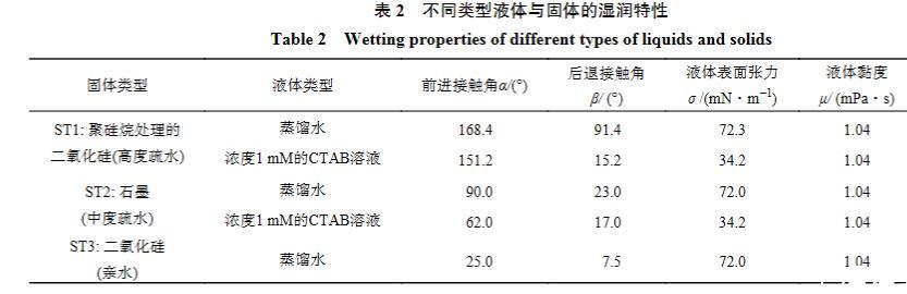 由于固、液兩相的表面特性會顯著影響固?液接觸角,從而影響液滴與顆粒的碰撞行為,筆者通過實驗測量和文獻分析,對比了固、液特性的變化對接觸角的影響。表1列出了測量固、液特性時所使用的具體儀器及添加劑。表2給出了不同固體和液體樣品的接觸角、表面張力和黏度。其中高度疏水固體ST1與不同液體接觸角通過實測得出,中度疏水固體ST2和親水固體ST3的測量數據來自ZHU等的研究。對比后發現,前進接觸角α明顯大于后退接觸角β,所以在分析塵?霧濕潤特性時應考慮前進角和后退角的差異。
