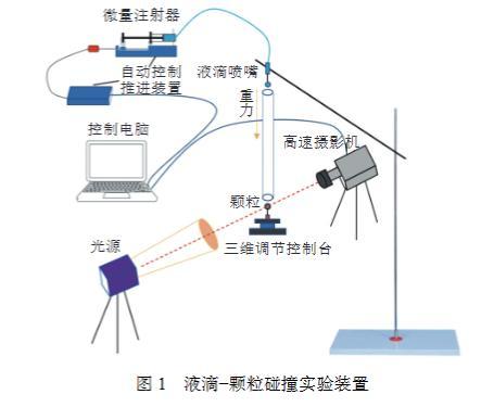為確保每次實驗保持一致,實驗采用電自動微量注射器產生大小一致的實驗液滴,并通過調節不同高度的注射器來改變液滴?顆粒碰撞速度。為防止環境氣流對液滴軌跡的影響,在注射器下方設置了一個空心圓筒。在三軸光學平臺上設置了樣品顆粒支座,利用EVA熱熔膠將樣品顆粒固定在支座的金屬支撐絲上。顆粒的位置可通過三軸光學平臺進行調整。使用了Phantom VEO410L高速相機(Vision Research公司)對碰撞過程進行捕捉拍攝。相機和光源分別位于樣品顆粒的兩側。相機的拍攝頻率設定為2 000 fps,圖像分辨率為1280×800像素。