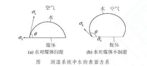 式中,θ為水與煤表面的接觸角,它是指在固、液、氣三相交界處,自固-液界面經(jīng)液體內(nèi)部而到液-氣界面的夾角。如果接觸角θ<90°屬可濕潤煤體,在相同的水表面張力系數(shù)條件下,θ角愈小,毛細作用力則愈大,增強了注水動力,潤濕能力愈大;若濕潤邊角θ>90°屬于不可濕潤煤體,θ角愈大,潤濕能力愈小。