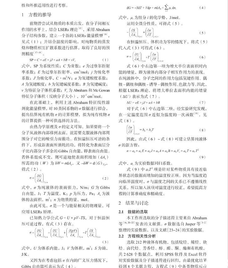 本工作提出一種將σ這一宏觀物性與微觀分子間作用力相關(guān)聯(lián)的一種新的計(jì)算方法。根據(jù)線性溶劑化能量關(guān)系(LSERs)理論和經(jīng)驗(yàn)方程,提出了在不同溫度下估算純有機(jī)物σ的關(guān)聯(lián)式。利用所得關(guān)聯(lián)式對(duì)2 628個(gè)純組分體系中的10個(gè)同系物進(jìn)行了回歸,得到了σ的關(guān)聯(lián)方程,并對(duì)方程的相關(guān)性和外推適用性進(jìn)行考察。