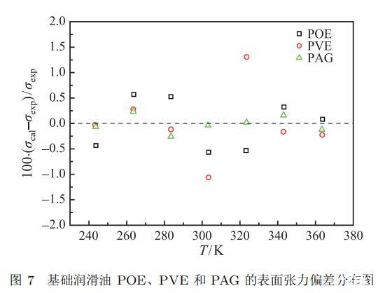 式中,T 是溫度,K;σ 是表面張力,mN·m?1;a、b 和 c 為關聯方程的擬合參數。基礎潤滑油 POE、PVE 和 PAG 的參數關聯值和絕對平均偏差列于表 4 中,其實驗數據與關聯方程的絕對平均偏差分別為 0.43%、0.45% 和 0.13%;三種基礎潤滑油的相對偏差分布如圖 7 所示,其實驗測量結果的相對偏差均在 ±1.5% 以內,表明實驗結果與關聯方程的吻合良好。