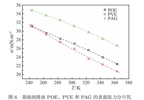 實驗測量了 POE、PVE 和 PAG 三種基礎潤滑油在常壓環境的表面張力,其溫度范圍為 243.15 ~ 363.15 K,實驗測量結果如表 3 所示。鑒于基礎潤滑油的飽和蒸汽壓非常低,需要在實驗裝置內充入一定壓力氣體來確保懸垂液滴的穩定形成,充入的氣體應不易溶于基礎潤滑油且低溫環境不會在玻璃觀察窗形成凝結液膜,因此在實驗測量過程中裝置內部充入 0.1 MPa 左右的氮氣。根據相應的實驗環境,表面張力測量所需的密度差 ?ρ 應為基礎潤滑油的液相密度減去氮氣的氣相密度,氮氣的氣相密度由 Refprop 軟件計算獲得。三種基礎潤滑油的表面張力隨溫度的變化趨勢如圖 6 所示,表面張力隨著溫度的增大而降低,在同一溫度條件下,PAG 表面張力最大,POE 次之,PVE 最小;但在 243.15 K 以下區域,PVE 的表面張力要大于 POE。