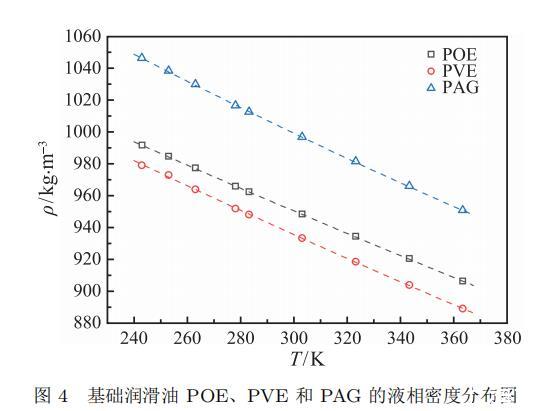 基礎潤滑油的液相密度是開展表面張力實驗研究的基礎數據,本文采用安東帕 DMA5000M 振動管密度計測量了 POE、PVE 和 PAG 三種基礎潤滑油在常壓環境下的液相密度,溫度范圍為 278.15 ~ 363.15 K。鑒于振動管密度計的測量溫度范圍有限,三種基礎潤滑油在低溫環境下的液相密度使用比重瓶法進行測量,溫度范圍為 243.15 ~ 278.15 K,其實驗測量結果如表 1 所示。