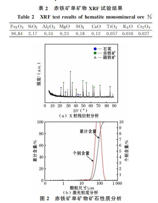 赤鐵礦單礦物則取自某鐵礦廠,將制備后的赤鐵礦樣品進行X射線衍射(XRD)分析、X射線熒光光譜(XRF)分析和激光粒度分析,XRD的分析結果如圖2(a)所示,XRF的分析結果見表2,粒度分析如圖2(b)所示。從圖2(a)和表2可以看出,Fe?O?峰強度最高,含量達到了96.84%,另外含有少量的氧化物SiO?、Al?O?等。從圖2(b)可以看出,樣品的中值粒徑D??達到了79.89μm,D??則達到了123.2μm.綜合上述純度以及粒度,赤鐵礦可滿足后續單礦物試驗的要求。