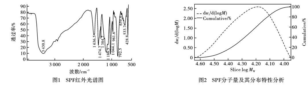 1)SPF紅外光譜分析(IR)SPF紅外光譜結(jié)果見圖1,3430.8cm?1為羥基伸縮振動峰,這不可能是醇羥基,而是酚羥基。3000cm附近有一個小峰,在1474.7cm是亞甲基變形振動峰,說明SPF中含有亞甲基。1636.5cm是苯環(huán)上的C=C鍵伸縮振動產(chǎn)生的特征吸收峰,在指紋區(qū)中的792.5cm?1區(qū)域中的譜帶是取代苯的1,2,6取代的特征吸收峰。1186.5cm?1和1044.1cm?1是由于S=O鍵伸縮振動產(chǎn)生的特征吸收峰,在700—500cm?1的連續(xù)吸收峰是S—O、S—S、C—S鍵伸縮振動產(chǎn)生吸收峰。SPF產(chǎn)物的分子中含有磺酸基、羥基和亞甲基等官能團。