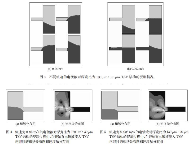 TSV深寬比設(shè)置為130μm:30μm,電鍍液流人速度為0.05 m/s和0.002 m/s的浸潤(rùn)仿真結(jié)果分別如圖3所示,前者在TSV底部形成氣泡,后者可以完全浸潤(rùn)。模擬結(jié)果表明降低電鍍液流入速度有利于浸潤(rùn)。通過(guò)仿真中兩種情況下浸潤(rùn)過(guò)程中的流速場(chǎng)對(duì)比,可以看出在電鍍液流入的過(guò)程中,電鍍液流人速度較大時(shí),如圖4(b)所示,電鍍液表面距離TSV較遠(yuǎn)的部分有著相對(duì)更大的流速,即電鍍液流過(guò)TSV上方的速度大于電鍍液向TSV內(nèi)部流入的速度,導(dǎo)致在電鍍液流過(guò)TSV上方時(shí),其流入TSV內(nèi)部的分流量還沒(méi)有充滿TSV內(nèi)部排出其中氣體之前,電鍍液就已經(jīng)流過(guò)了TSV上方,并將TSV口部封死,導(dǎo)致內(nèi)部殘留氣體無(wú)法排出,形成不完全浸潤(rùn);而當(dāng)電鍍液流入速度較小時(shí),如圖5(b)所示,電鍍液表面在TSV口部附近具有相對(duì)更大的流速,即電鍍液向TSV內(nèi)部流入的速度大于其流過(guò)TSV上方的速度,使得電鍍液流過(guò)TSV上方時(shí),有足夠的分流量流入TSV內(nèi)部,將其中氣體排出并將TSV填滿,實(shí)現(xiàn)完全的浸潤(rùn)。