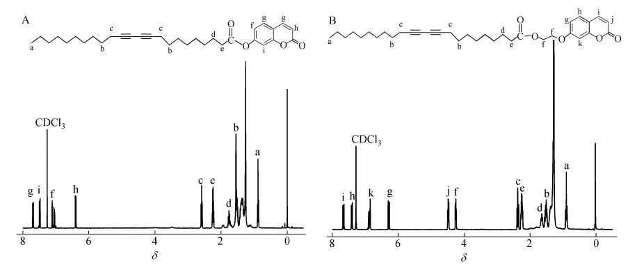 2類香豆素取代二乙炔單體參照文獻所述方法合成,分子結構及產物核磁譜圖如圖1所示。將2種產物分別溶于氯仿,配成1mg/mL的溶液。亞相為超純水(18.2MΩ·cm)。所有的π-A曲線和LB膜拉制實驗均為20℃條件下在KSV Mini-trough LB膜儀上進行。溶劑充分揮發后,膜障以5 mm/min的速率對其壓縮,在20℃和恒定膜壓35 mN/m下以2mm/min速率沉積Y-型LB膜?;瑸槭⑵1∧さ木酆鲜窃?6W的紫外燈(波長254nm)輻照下完成的,薄膜表面距離燈管下緣10cm,輻照時間5min。