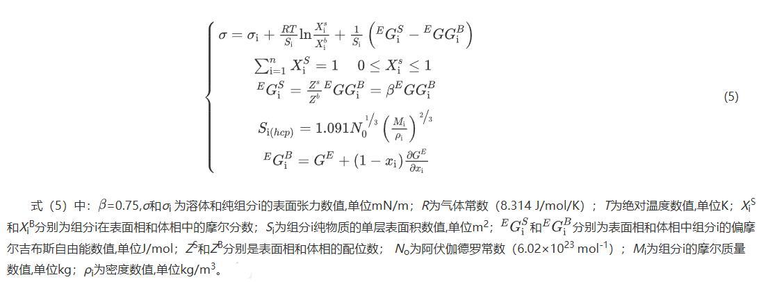 式(5)中:=0.75,σ和σi為溶體和純組分i的表面張力數(shù)值,單位mN/m;R為氣體常數(shù)(8.314 J/mol/K);T為絕對溫度數(shù)值,單位K;XiS和XiB分別為組分i在表面相和體相中的摩爾分數(shù);Si為組分i純物質的單層表面積數(shù)值,單位m2;分別為表面相和體相中組分i的偏摩爾吉布斯自由能數(shù)值,單位J/mol;ZS和ZB分別是表面相和體相的配位數(shù);No為阿伏伽德羅常數(shù)(6.02×1023 mol-1);Mi為組分i的摩爾質量數(shù)值,單位kg;ρi為密度數(shù)值,單位kg/m3。