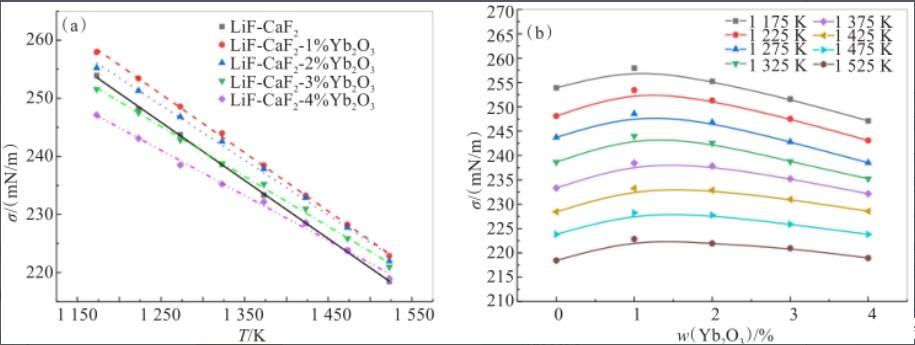 圖3溫度(a)和Yb2O3含量(b)對LiF-CaF2熔鹽體系表面張力的影響