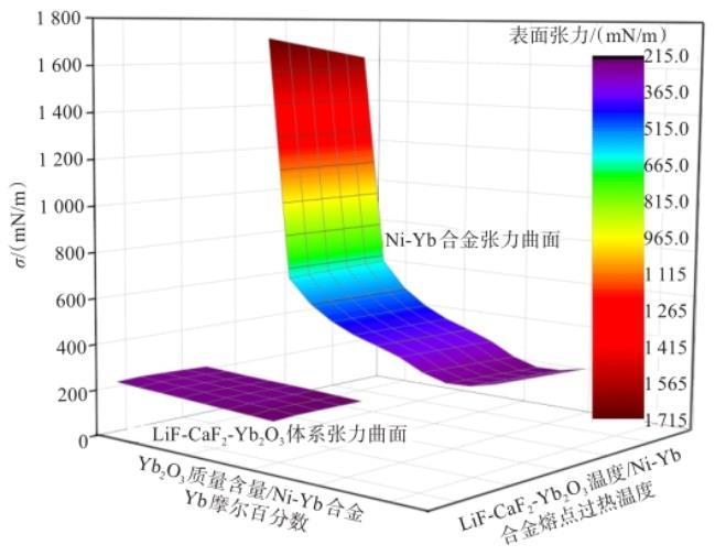 圖4 Ni-Yb合金與LiF-CaF2-Yb2O3體系表面張力曲面對比