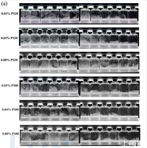 研究結果顯示,表面活性劑濃度越高,表面張力降低越明顯。比較兩種常用表面活性劑,PS20降低表面張力的效果比PS80更強。
