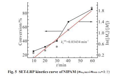 為了探索混合配體對聚合反應的影響,固定單體NIPAM加量為10mmol,溶劑H2O加量為6mL,催化體系CuBr加量為0.025mmol,引發劑a-溴代異丁酸加量為0.0856mmol,混合配體共0.05mmol,反應溫度為室溫25℃,考察混合配體摩爾比對聚合反應的影響,結果如Fig.3,Fig.4,Fig.5,Fig.6和Fig.7所示。