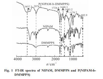 對單體NIPAM,DMMPPS及共聚物P(NIPAM-b-DMMPPS)進行紅外表征,結果如Fig.1所示。通過對比分析可以看出,P(NIPAM-b-DMMPPS)紅外譜圖中,3437cm-1為PNIPAM鏈段酰胺基中仲胺N-H的伸縮振動吸收峰,2974cm-1為飽和C-H伸縮振動吸收峰,1724cm-是PNIPAM鏈段中羰羰基C=O的伸縮振動吸收峰,1648cm-1的吸收峰為O-C=O的伸縮振動峰,1483cm-1為飽和一CH2一的伸縮振動峰,1179cm-1是PDMMPPS鏈段中S=O鍵的吸收峰,603 cm-1為C一Br的振動峰。紅外光譜結果分析表明,此共聚物由單體NIPAM,DMMPPS合成為預期的目標產物。