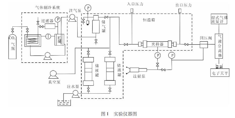 實(shí)驗(yàn)所用裝置為地質(zhì)封存條件下CO2遷移物模擬平臺(tái),如圖1所示。主要結(jié)構(gòu)分為以下幾個(gè)系統(tǒng):氣體制冷系統(tǒng)、氣體注入驅(qū)替系統(tǒng)、液入驅(qū)替系統(tǒng)、回環(huán)壓系統(tǒng)、巖心夾持系統(tǒng)、量系統(tǒng)、抽真空系統(tǒng)及數(shù)據(jù)采集和微機(jī)測(cè)控系統(tǒng)等。CO2氣體經(jīng)氣體制冷系統(tǒng)冷卻后通過(guò)注氣壓注入儲(chǔ)氣罐,最大注入壓力20MPa。液體現(xiàn),通過(guò)注水泵恒流注入儲(chǔ)液罐,最大注入流量為9.9ml/min。通過(guò)注射泵設(shè)置回、環(huán)壓。儲(chǔ)氣罐和儲(chǔ)液罐通過(guò)出氣、出液閥門(mén)將CO2、液體括注入巖心夾持器。通過(guò)真空泵對(duì)巖心抽真空。口端的氣體、液體通過(guò)氣液分離器分離,氣體通過(guò)濕式氣體流量計(jì)記錄瞬時(shí)和累計(jì)流量,體通過(guò)電子天平稱(chēng)重的方式記錄其瞬時(shí)和累g計(jì)流量。瞬時(shí)的入口、出口壓力通過(guò)計(jì)算機(jī)記秦玉錄。儲(chǔ)氣罐、儲(chǔ)液罐、巖心夾持器都放置于恒溫況箱內(nèi),通過(guò)恒溫箱控制其內(nèi)部溫度,范圍為室溫至120℃。