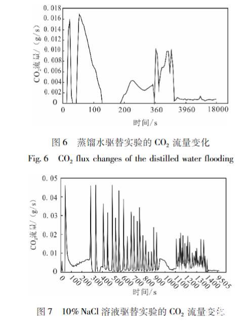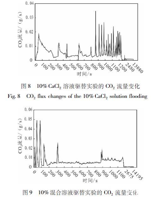 由CO2流量曲線可以發(fā)現(xiàn),以驅(qū)替液突破巖心為分界點(diǎn),也可以將CO2流量隨時(shí)間變化劃分為兩個(gè)階段:驅(qū)替液突破巖心前,CO2流量隨時(shí)間都發(fā)生較大的波動(dòng)(活塞式驅(qū)替階段);驅(qū)替液突破巖心后,CO2氣體流量迅速減少,并且最終趨于一個(gè)穩(wěn)定值,CO2流量曲線幾乎不再波動(dòng)帶式驅(qū)替階段)。因?yàn)榛钊津?qū)替階段中驅(qū)替出的CO2速率是劇烈變化的,所以CO2流量隨時(shí)間發(fā)生了較大的波動(dòng)。這一穩(wěn)定值的出現(xiàn),是因?yàn)閷?shí)驗(yàn)開(kāi)始一段時(shí)間后,巖心中可被驅(qū)替的超臨界CO2已被完全驅(qū)替,巖心中只剩下被毛細(xì)力所束縛的CO2。驅(qū)替液流出后,由于溫度和壓力的降低,本來(lái)溶解在驅(qū)替液中的CO2散逸出來(lái),而驅(qū)替液初始溶解的CO2量是一定的,散逸出的CO2也是一定的,所以CO2氣體流量最終趨于穩(wěn)定。對(duì)比圖6一圖9發(fā)現(xiàn),10%NaCl和10%CaCl2溶液驅(qū)替實(shí)驗(yàn)的CO2流量曲線隨時(shí)間波動(dòng)最為劇烈,混合溶液次之,波動(dòng)最小的是蒸餾水驅(qū)替實(shí)液驗(yàn)的CO2流量曲線。