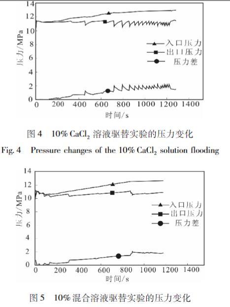 雖然在實(shí)驗(yàn)開(kāi)始前,會(huì)通過(guò)回壓控制裝置將壓設(shè)置在10 MPa,但是在實(shí)驗(yàn)過(guò)程中巖心夾持度的巖心放器的人口、出口壓力會(huì)出現(xiàn)波動(dòng)。通過(guò)實(shí)驗(yàn)得到通過(guò)回巖心夾持器人口、出口壓力及二者壓力差的變化