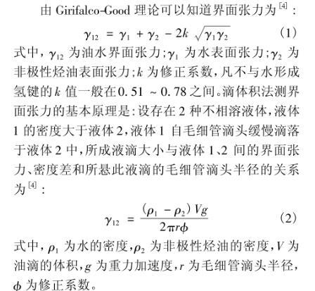 式中,γ??為油水界面張力;γ?為水表面張力;γ?為非極性烴油表面張力;k為修正系數,水不與水形成氫鍵的k值一般在0.51~0.78之間。滴體積法測界面張力的基本原理是:設存在2種不相溶液體,液體1的密度大于液體2,液體1自毛細管滴頭緩慢滴落于液體2中,所成液滴大小與液體1、2間的界面張力、密度差和所懸此液滴的毛細管滴頭半徑的關系為: