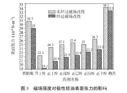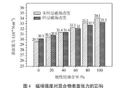2)經過磁場改性后,極性烴油的表面張力會降低。