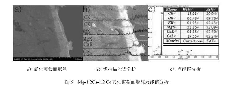 4)通過氧化膜的截面檢測(cè)和熱力學(xué)計(jì)算分析得出Mg-1.2Ca-1.2Ce的形成的氧化膜大致分為3層:外層是MgO,中間層是CaO,內(nèi)層是Ce2O3。